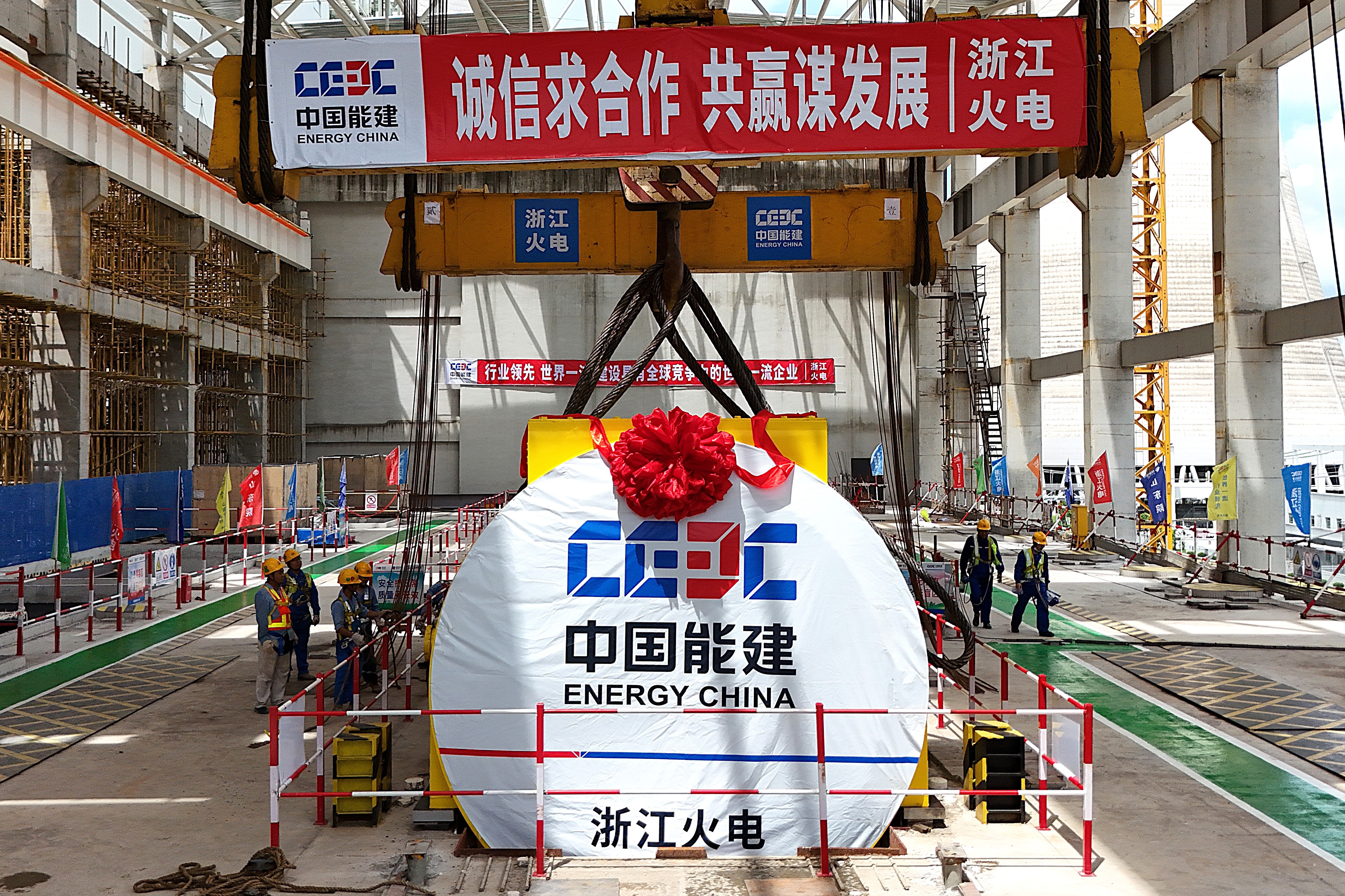 8月31日,中国金年会浙江火电承建的广西钦州电厂三期4×660兆瓦煤电项目3号机组发电机定子吊装就位。